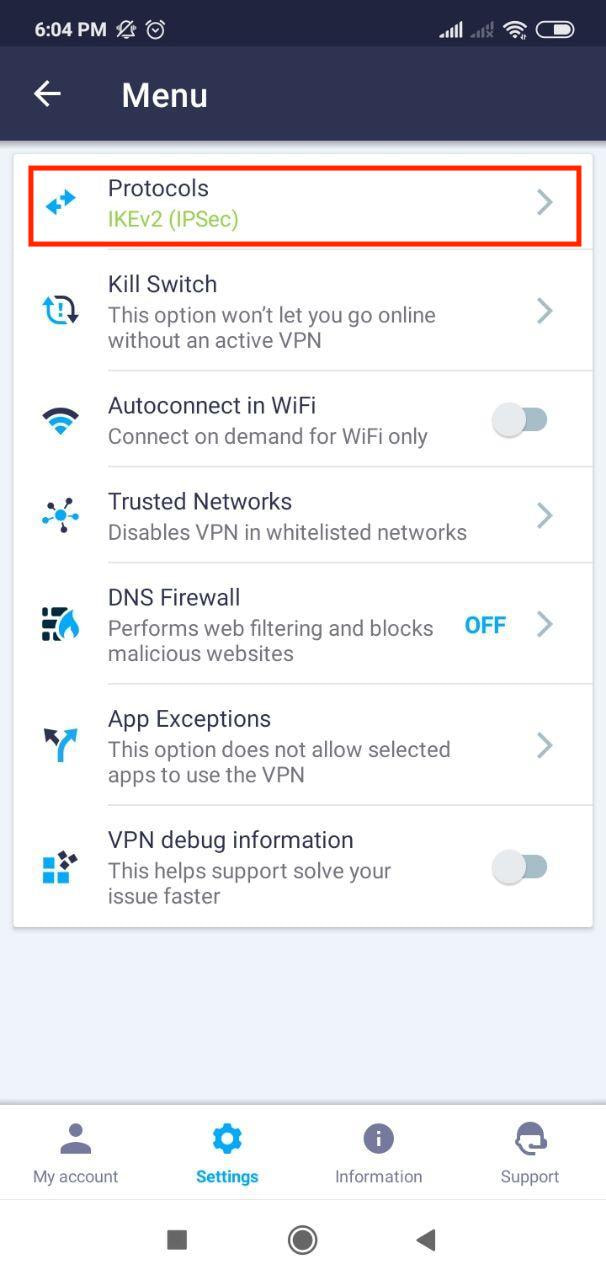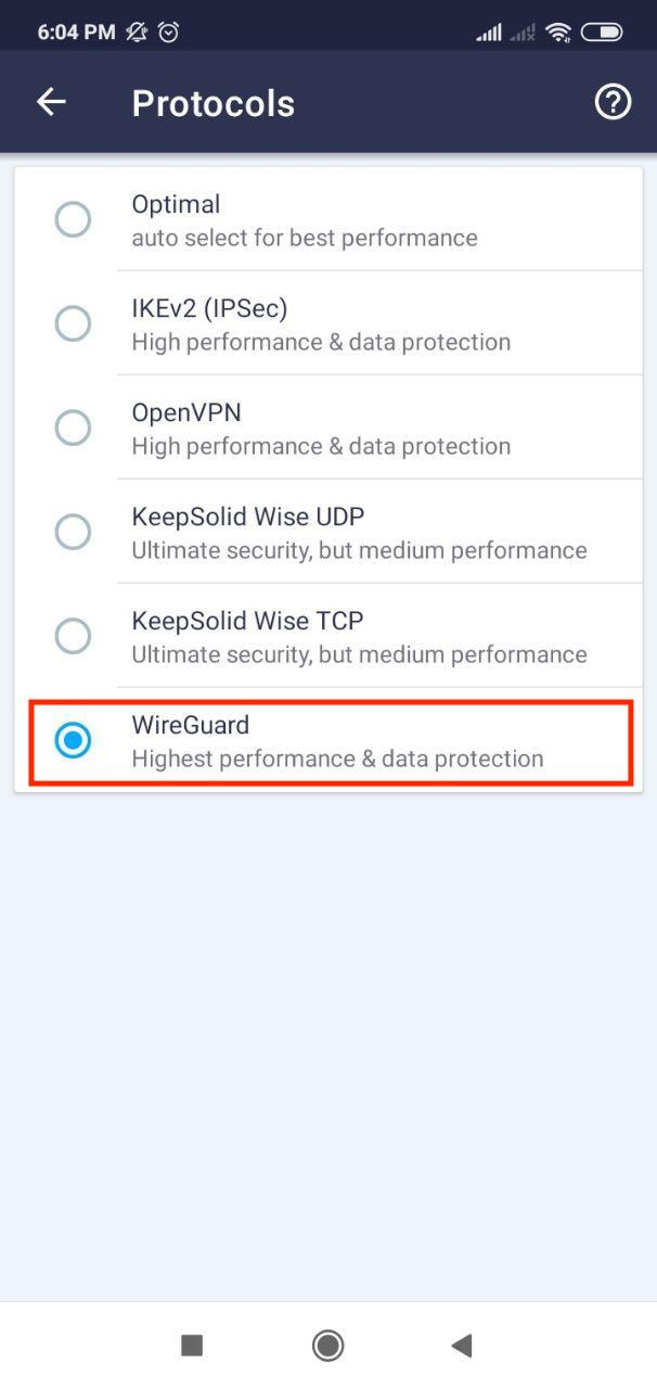 4. Choisissez le protocole VPN WireGuard® et revenez à l'écran principal en appuyant sur la flèche dans le coin supérieur gauche.