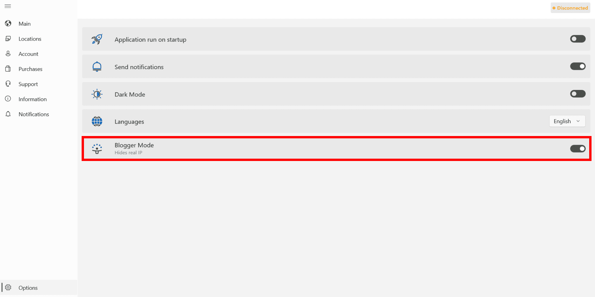 Voila! You have successfully enabled Blogger Mode. Now your real IP will not be displayed on the main screen of the application.