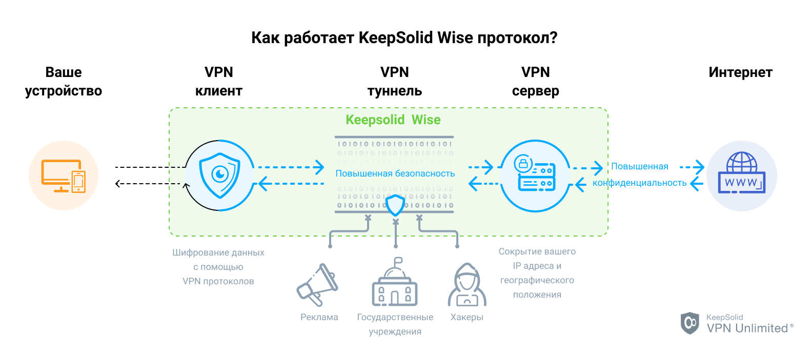 Наша специальная технология KeepSolid Wise обеспечивает пользователям расширенную свободу действий в сети. Она позволяет пользователям обойти любые блокировки VPN протоколов и использовать VPN Unlimited, даже если он обычно заблокирован в вашем учебном заведении, на работе или в сети отеля, где вы остановились. Благодаря протоколам TCP, UDP и TLS, а также основы в виде OpenVPN®, чрезвычайно сложно засечь нашу технологию, что позволяет надежно обходить блокировки VPN. Это связано с тем, что весь ваш VPN трафик будет выглядеть как обычный HTTPS трафик.